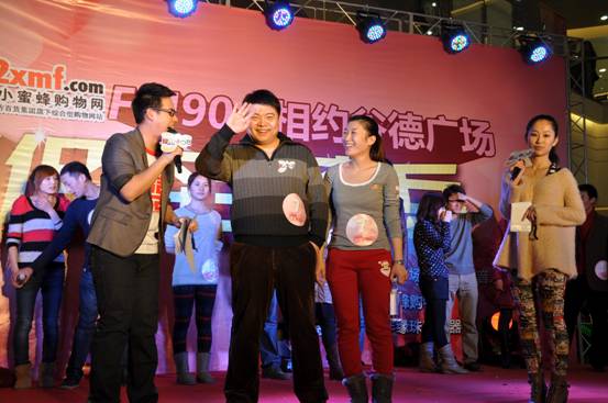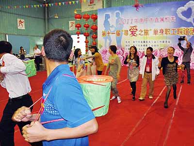 具体办法:有一枚女士出面任秋香,由秋香点唐伯虎,两位男士配合女士点唐伯虎,具体点法观众点唐伯虎号,然后唐伯虎亮出题板,由两位男士按题版表演,女士猜词,词由舞台下观众随机提供(最好是领导)写在号牌背面,由“唐伯虎”给两位男士观看。猜错继续猜下一位,号牌词换掉。猜对则被猜中者下台。最后剩下的男士为真唐伯虎,由提供词的领导但他任红娘,给二人合影留念,举行婚礼仪式。
